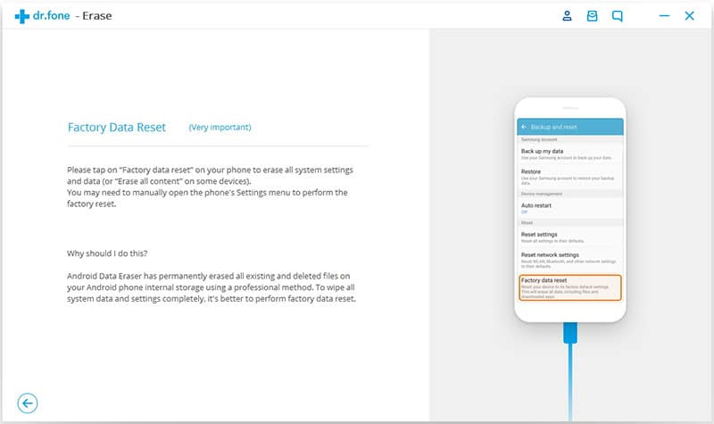 After all data such as photos, app data and personal data have been deleted permanently, Android Data Eraser will ask you to perform factory data reset on your phone. So, simply tap on “Factory Data Reset” or “Erase All Data” on the phone. This will erase all the settings on the phone.