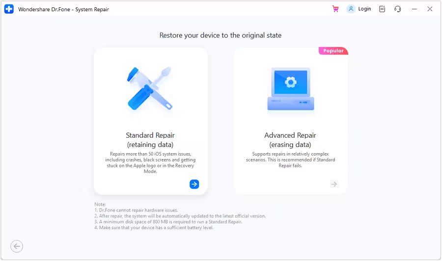 Step 4: Select Standard Repair as a mode of repairing for your iOS device.