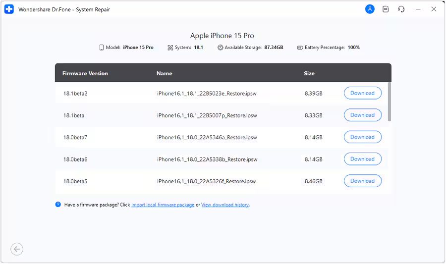 Step 6: After entering your iOS device into Recovery Mode, the platform will automatically detect the iOS firmware to be installed in the device. Click Download next to the iOS firmware you wish to install.