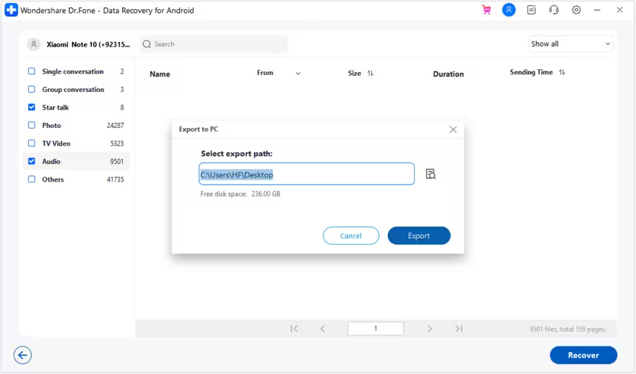 Step 10: Finally, select the data that you wish to recover and click on Recover button. You will be then asked to allocate the location and click on Export.