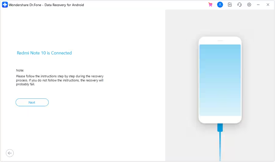 Step 4: Connect your Android device to computer. The software will automatically detect your device and you will see the successful connection of your device. Click on Next to begin the recovery process.