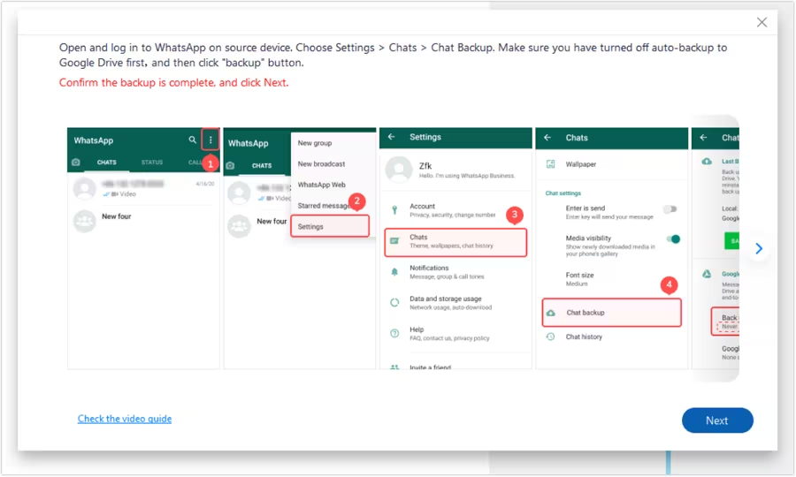 Step 6: Before you successfully conclude entire process, you will need to follow the on-screen instructions to backup WhatsApp data. On your Android, open WhatsApp, tap on 3 dot vertical lines and go to Settings. Go to Chats > Chat backup and turn off Auto backup on Google Drive. Once done, click on Backup button to backup your WhatsApp data on the device.