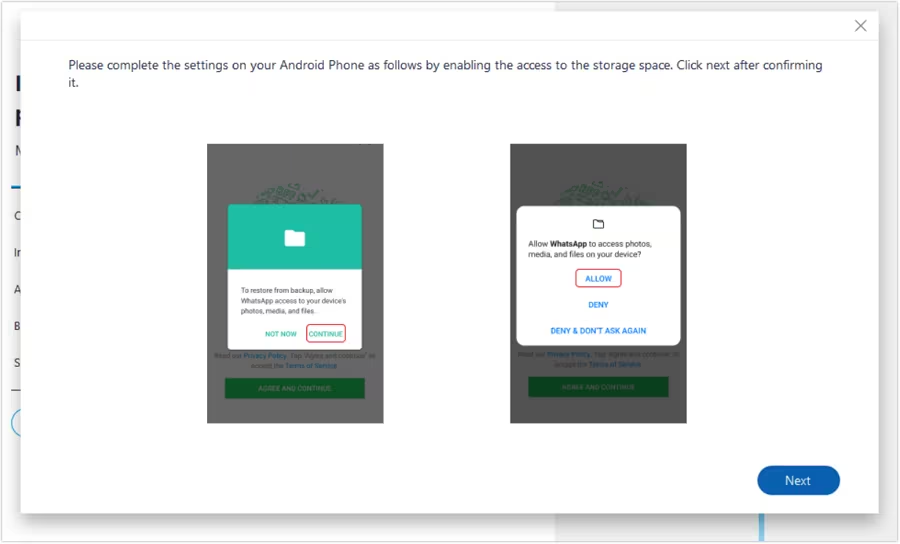 Step 7: After that, WhatsApp will automatically get uninstalled on your Android and will be re-installed again. When it does and launches on the device, allow all required permission and click on Next on your computer screen.