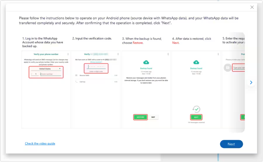 Step 8: You will be asked to activate your WhatsApp with your registered mobile number. Enter the number, verify your account and proceed to automatically search for a Backup file to restore. Tap on Restore button as the backup file is found and continue to tap Next on your Android. Once you successfully set-up your WhatsApp, click Next on the computer screen.